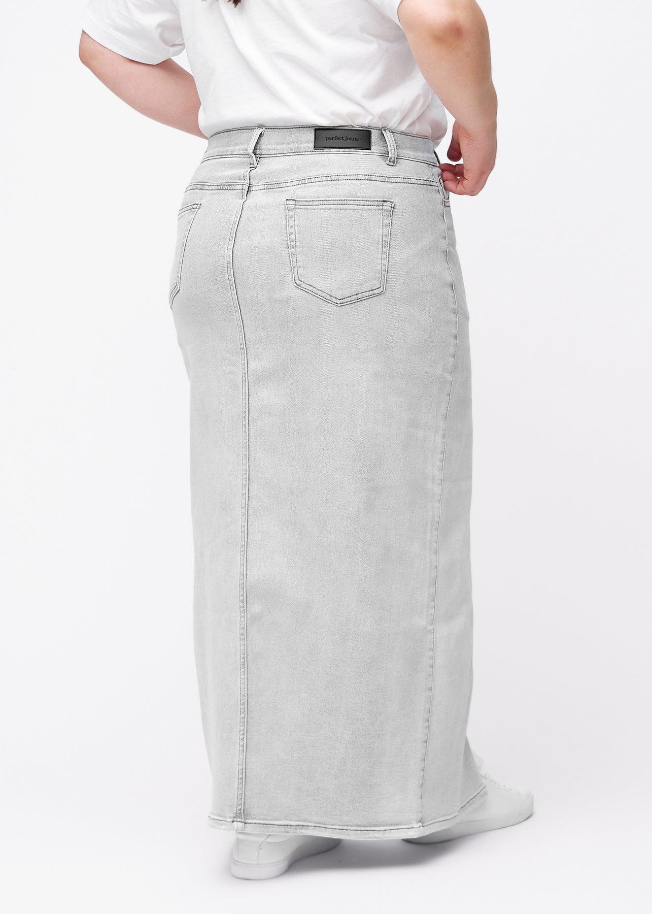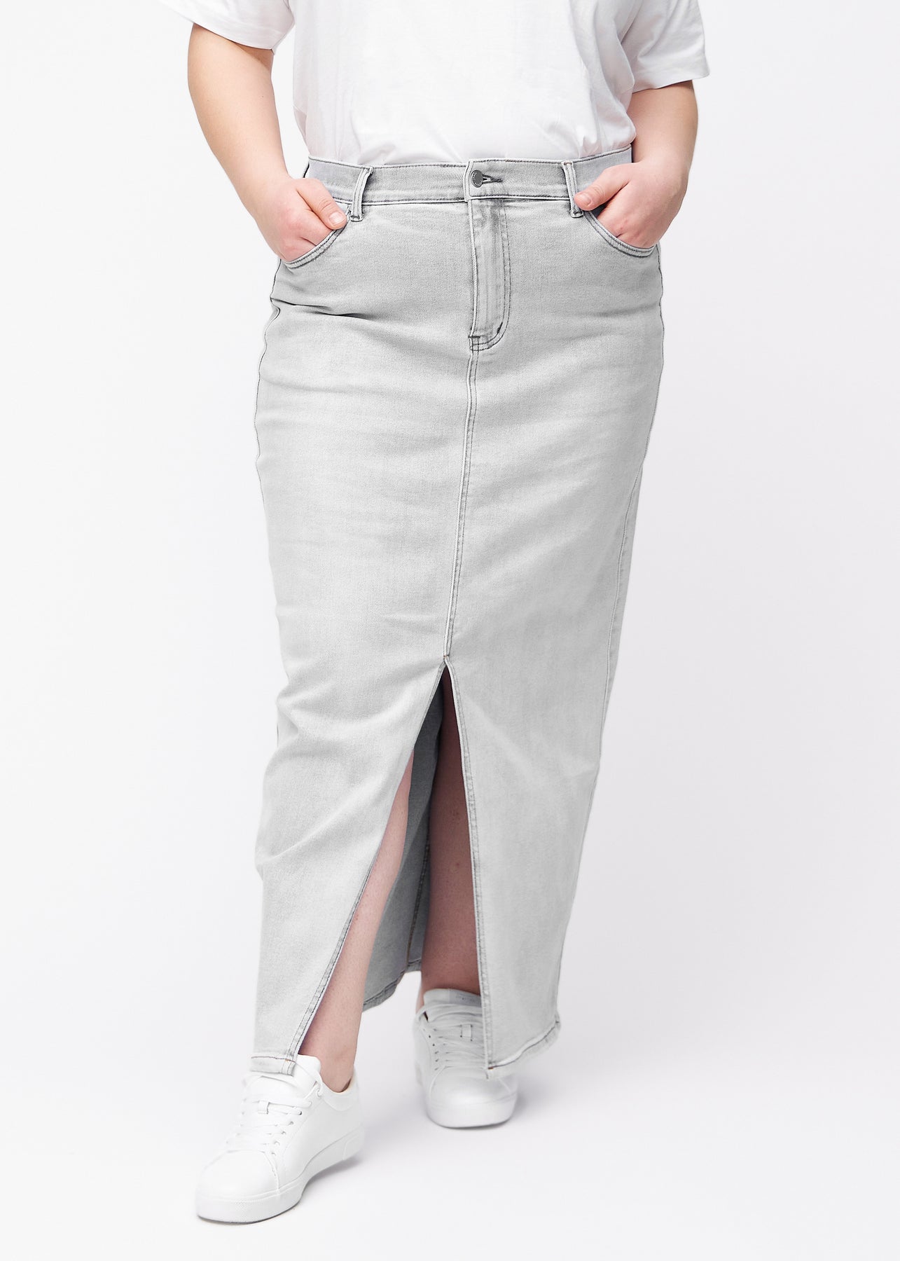 Fuldt billede af plus-size model i lang, lysegrå denimnederdel i farven Ashes med regulær pasform og slids foran.