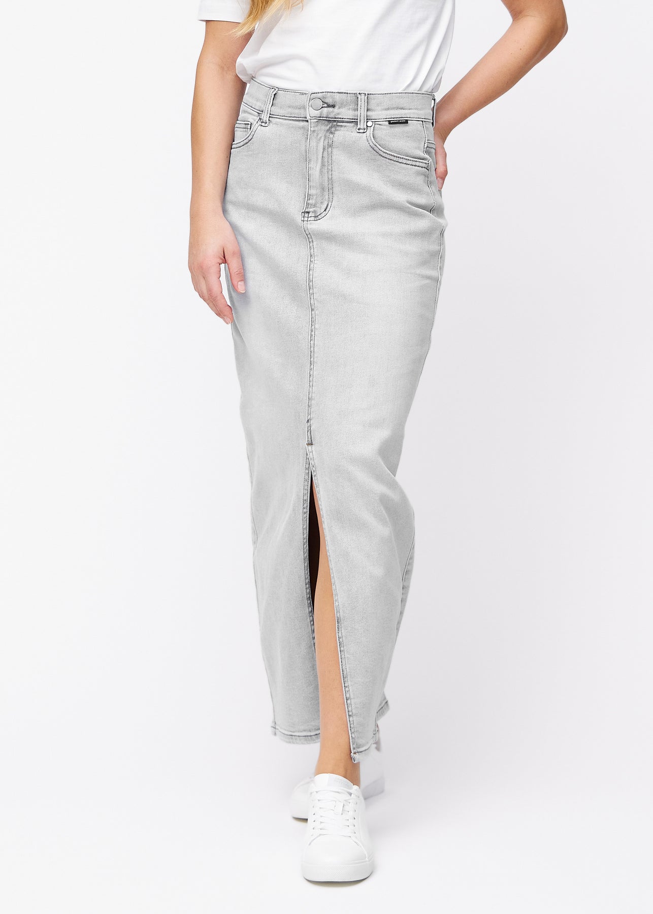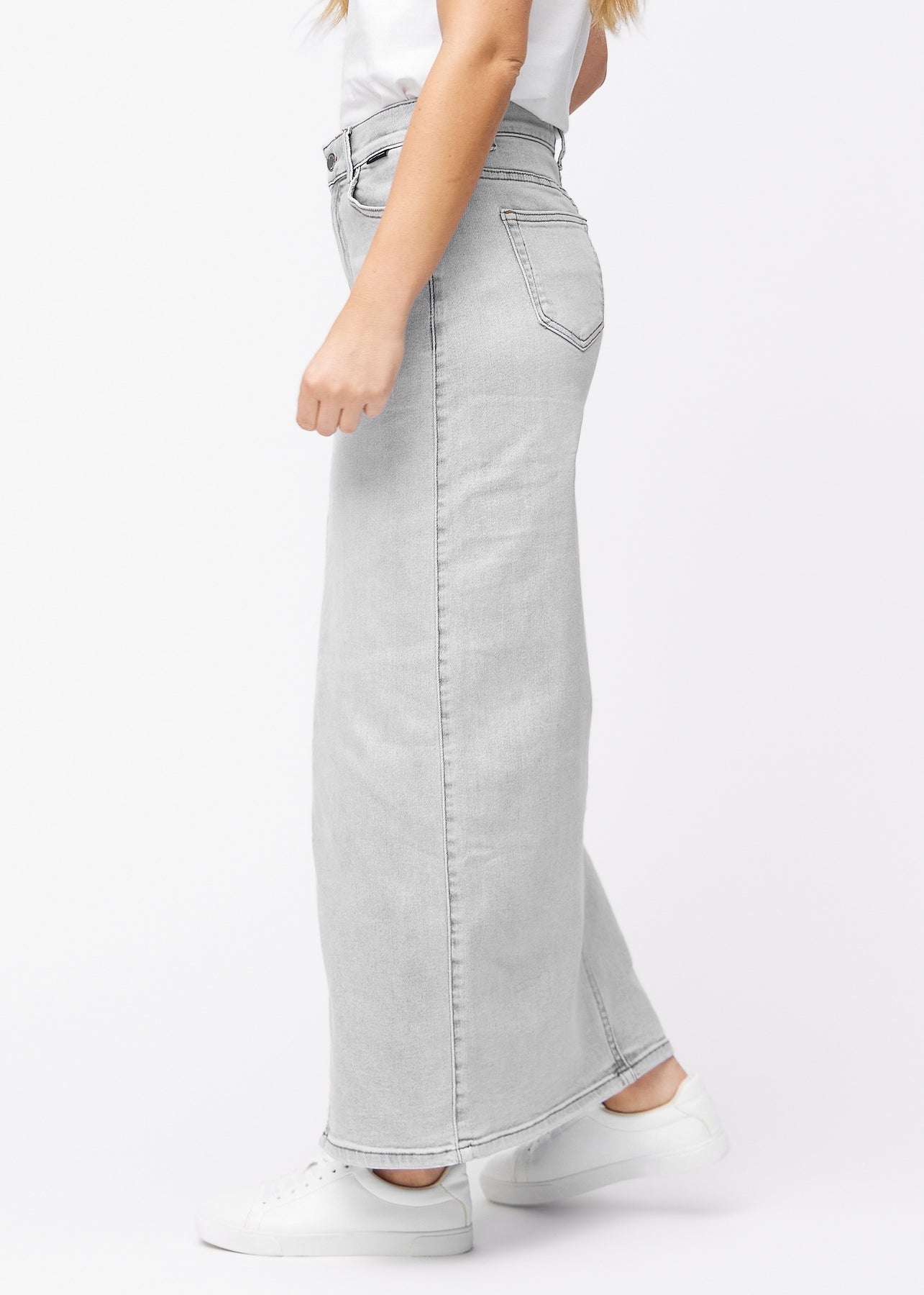 Lang, lysegrå denimnederdel i farven Ashes med regulær pasform set fra siden på model, med synligt slids foran.