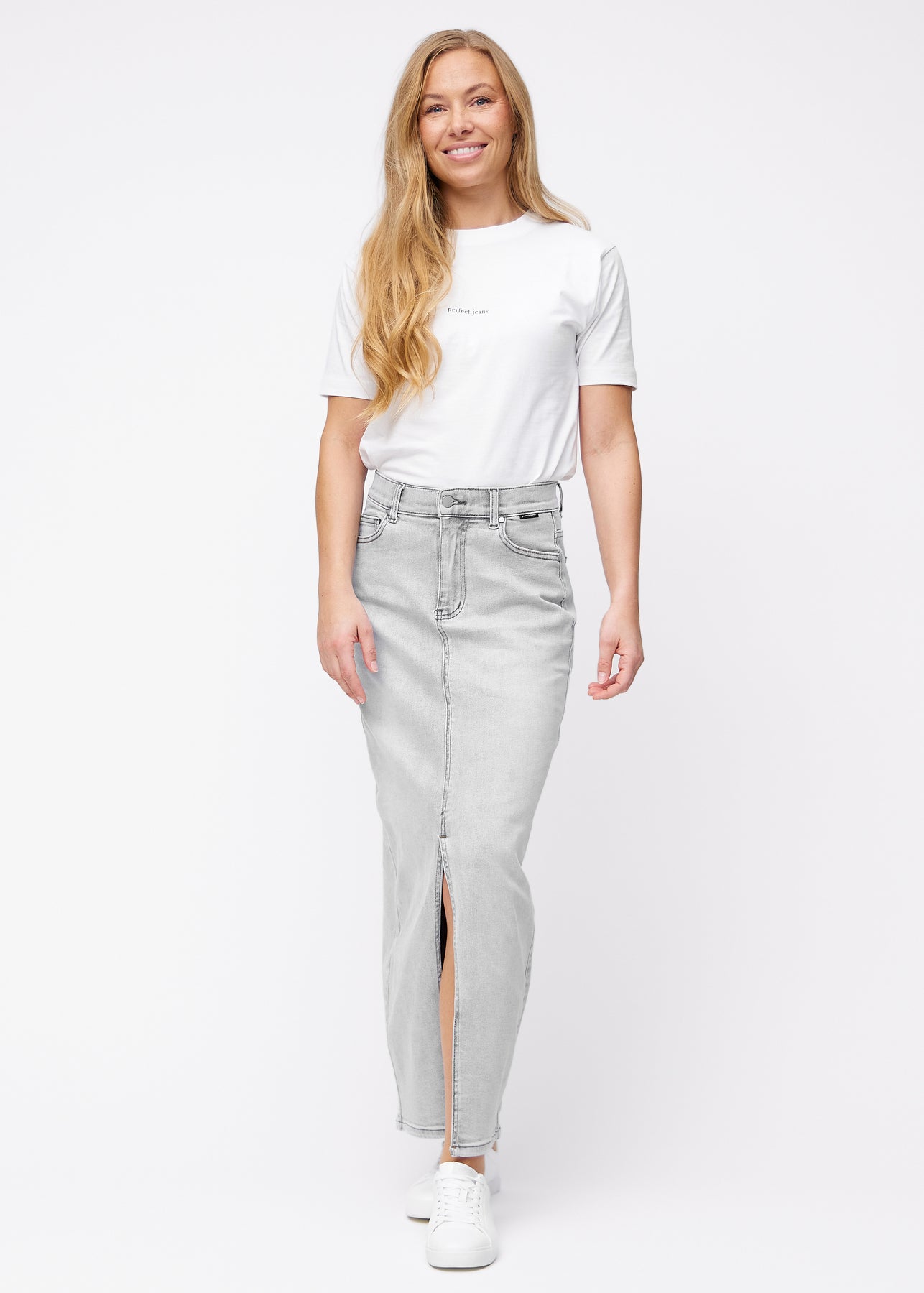 Fuldt billede af model i lang, lysegrå denimnederdel i farven Ashes med regulær pasform og slids foran.