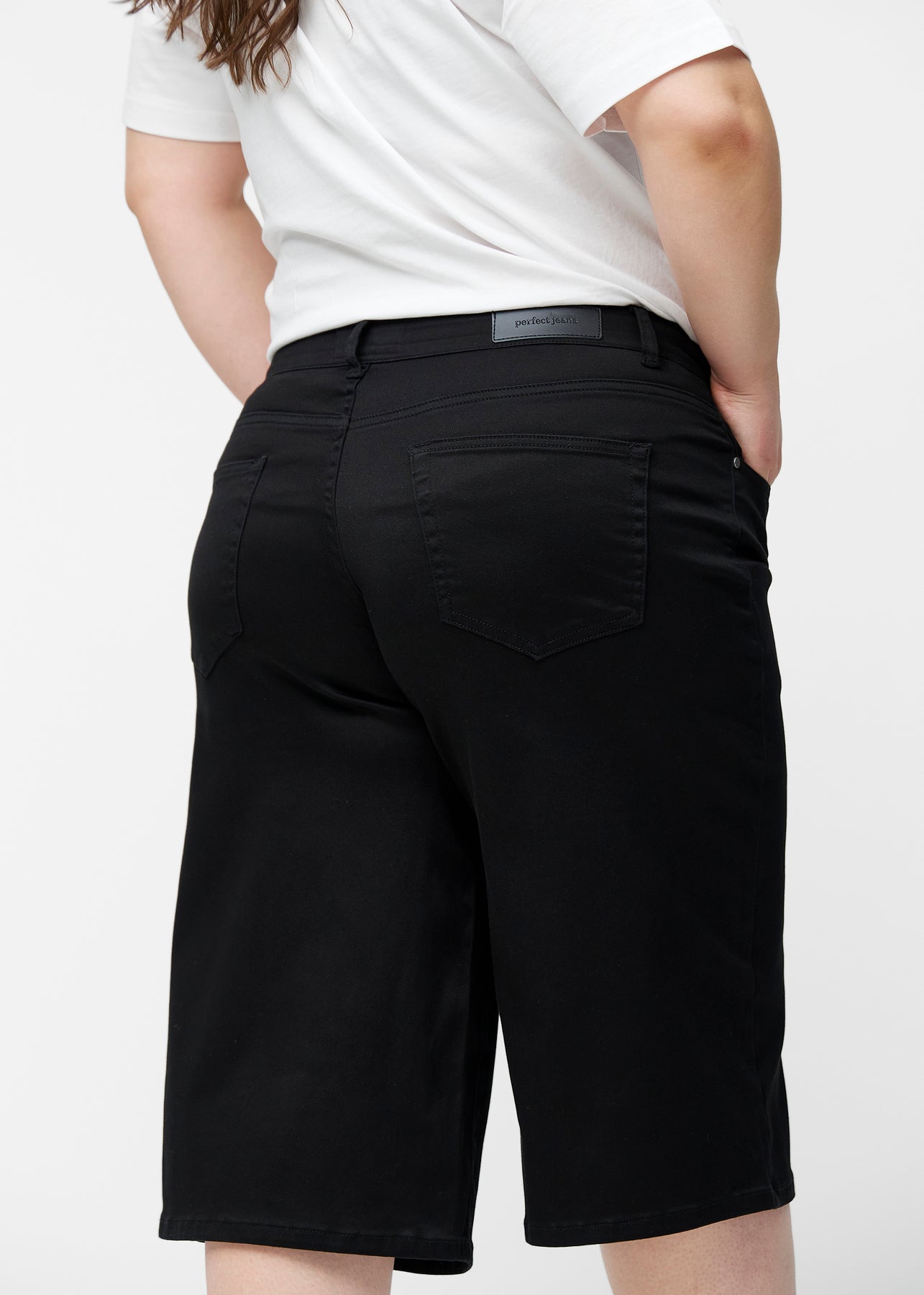 Close-up of black jeans material with the Perfect Jeans logo label at the edge of the front pocket on a plus-size model.