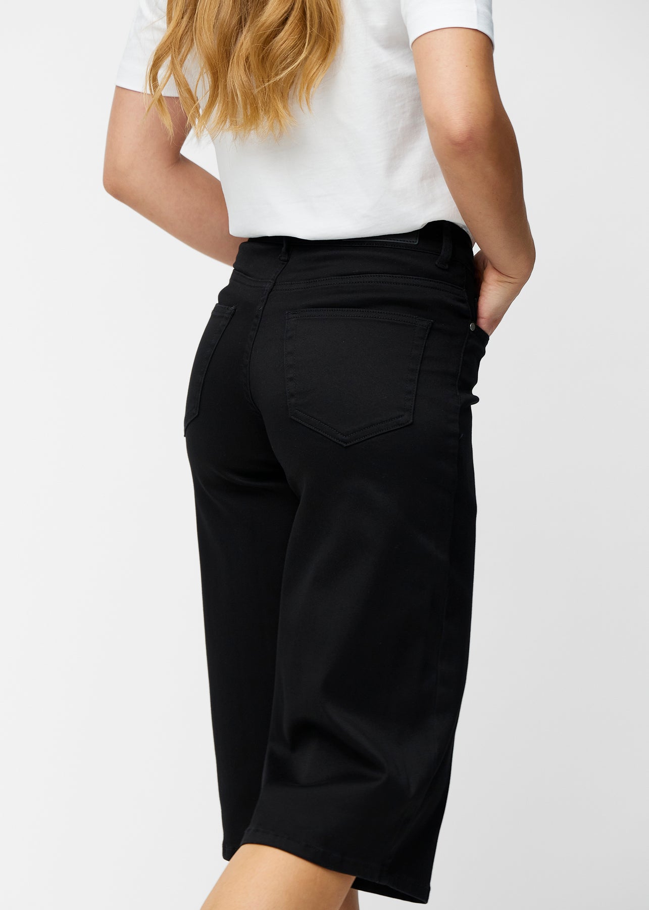Løse, sorte capris i farven Ravens set bagfra, så pasform og længde kan ses.