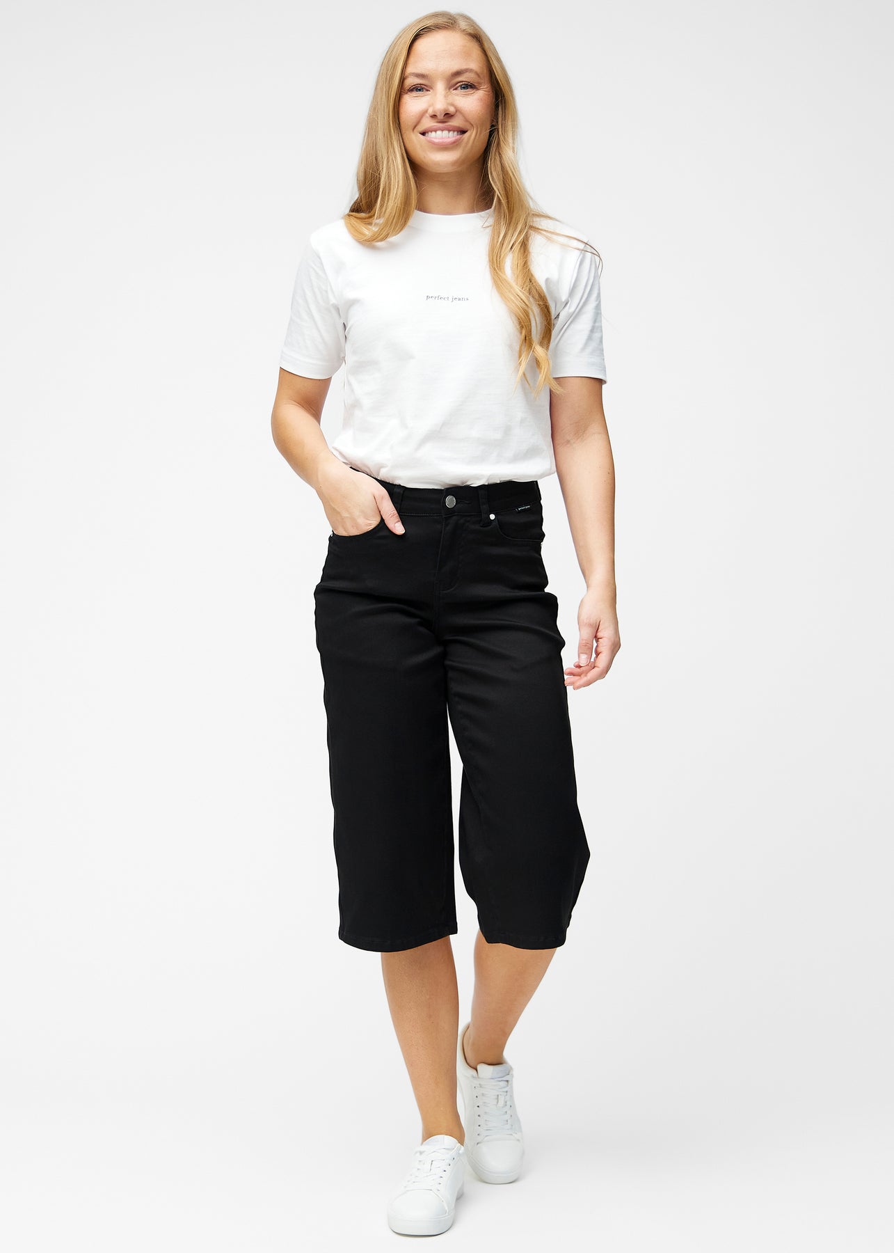 Perfect Capris - Loose in Ravens are black denim capris for women with a clean and modern look. The fit sits at the hips and falls loosely over the thighs for a relaxed silhouette. The capris fall just below the knee and are our most loose-fitting model. The wide shape provides air and freedom of movement, while the deep pockets at both the front and back make them practical for everyday wear.