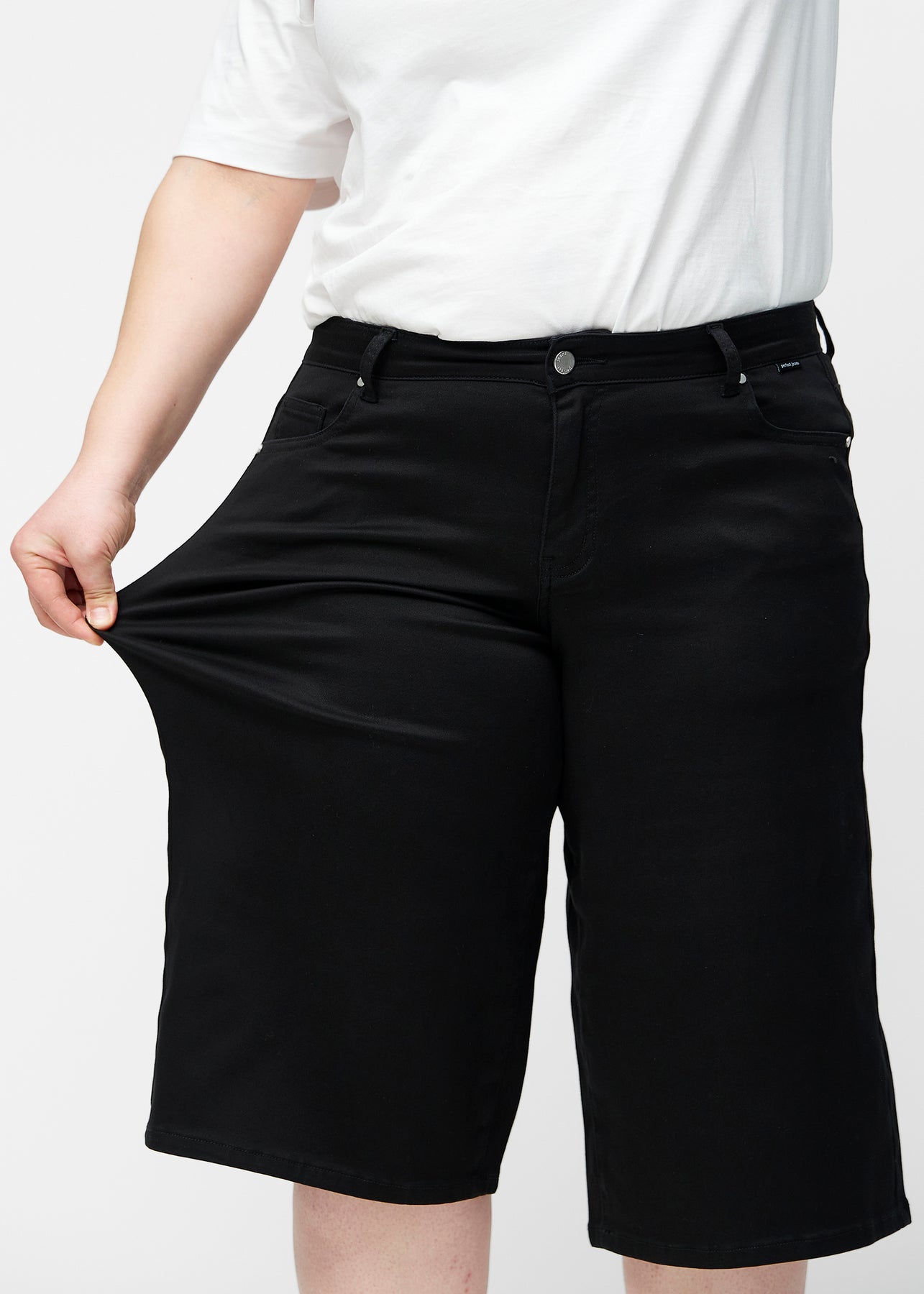 Plus-size model strækker de løse, sorte capris i farven Ravens ved hoften for at vise materialets stretch.