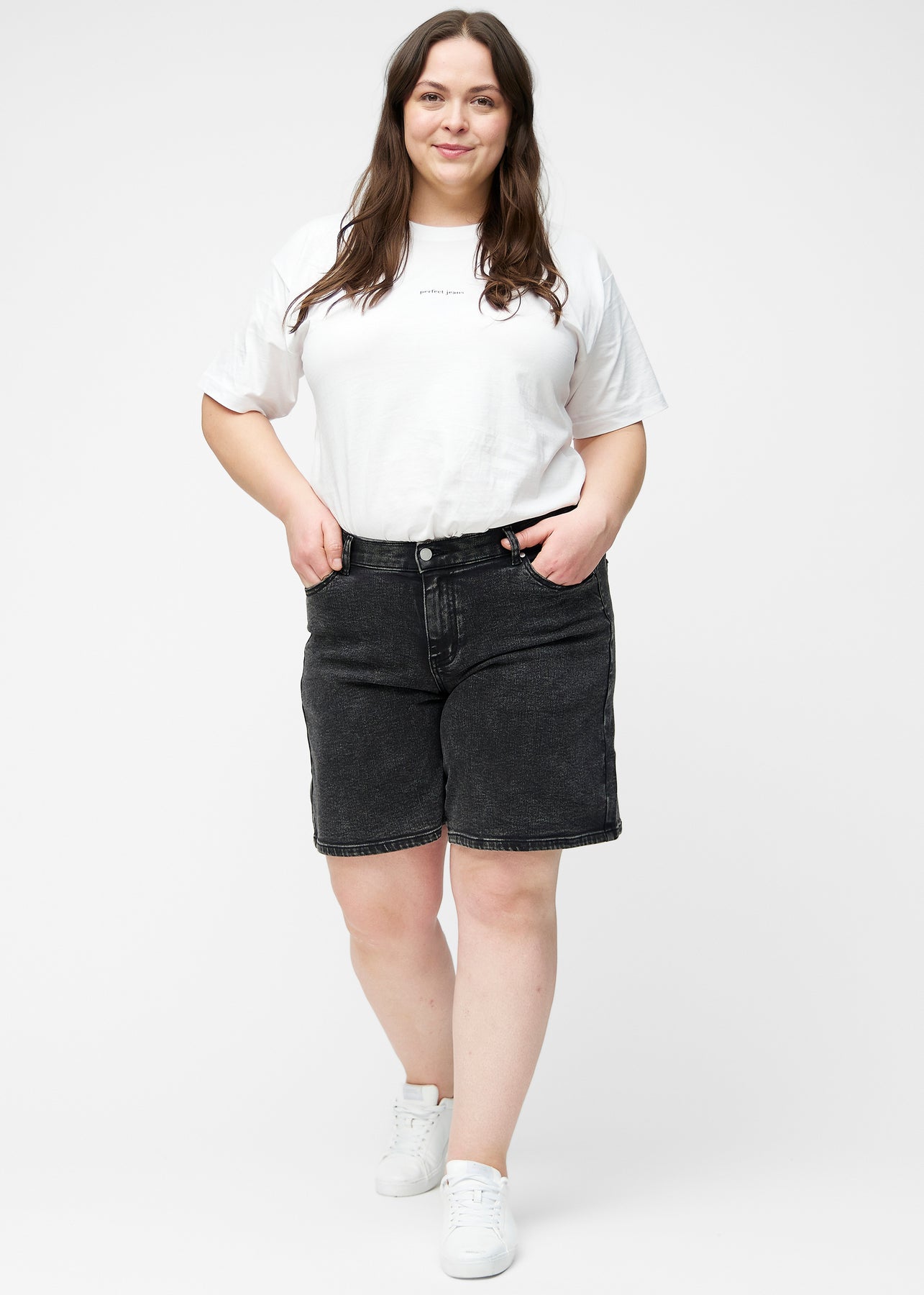 Fuldt billede af plus-size model i løse, mørkegrå denim shorts i farven Shadows, der går til lige over knæet.
