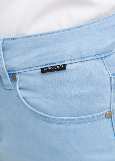 Perfect Shorts - Short - Skinny - Skies are our beautiful light blue short shorts, which are stretchy and provide you with the highest comfort in everyday life. Our light blue women's shorts reach mid-thigh and have a snug fit. They are high-waisted and have two deep pockets in the front and back. They are designed to be long-lasting and retain their color and shape after washing and use. The light blue shorts go with any outfit and are a must-have in any wardrobe.