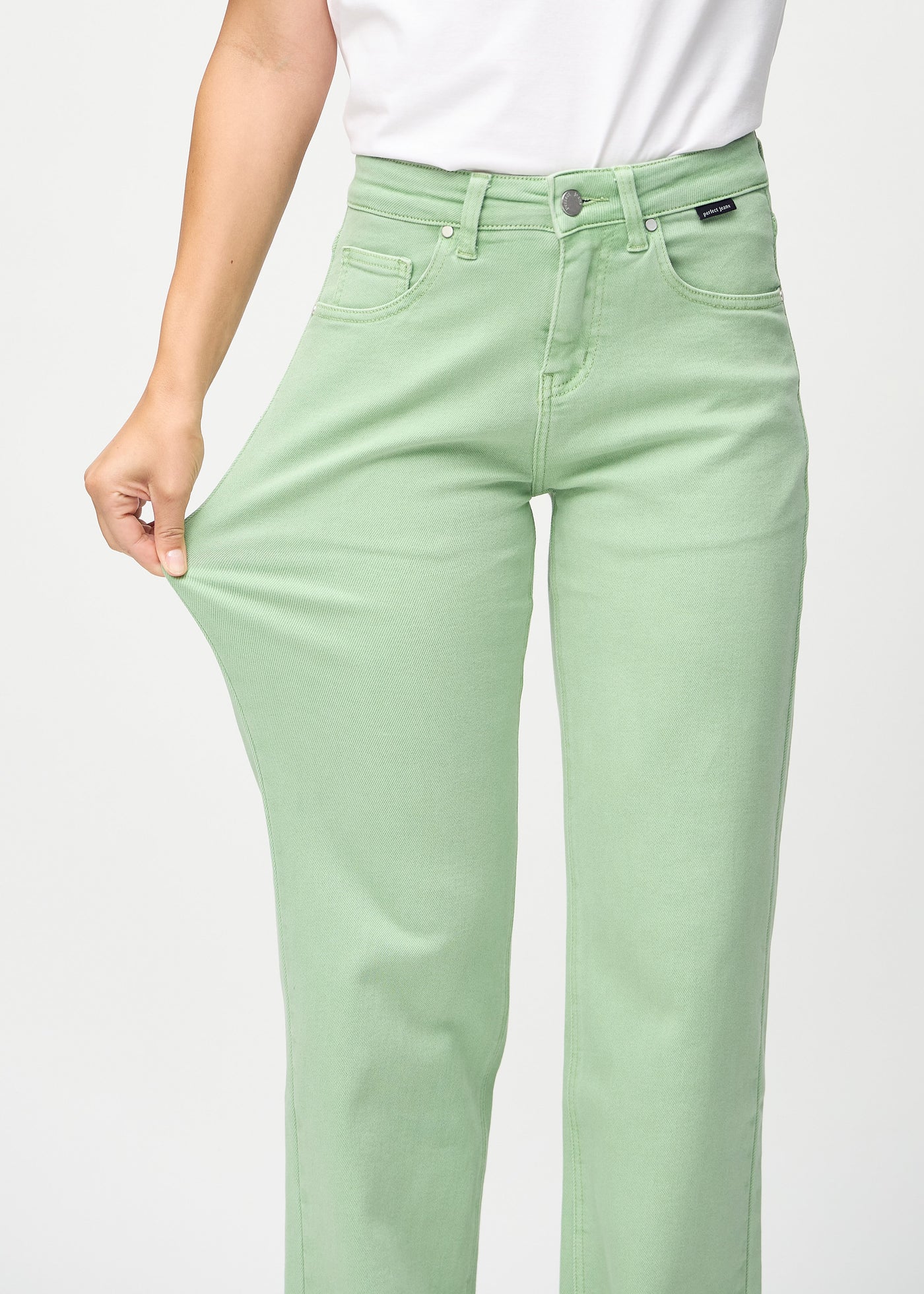 Lysegrønne loose jeans, modelnavn Mints, som er løstsiddende med masser af vidde i benene, set forfra.
