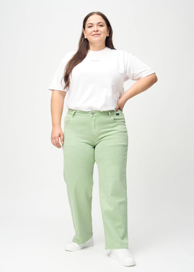 Lysegrønne loose jeans set fra siden på en plus-size model.